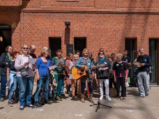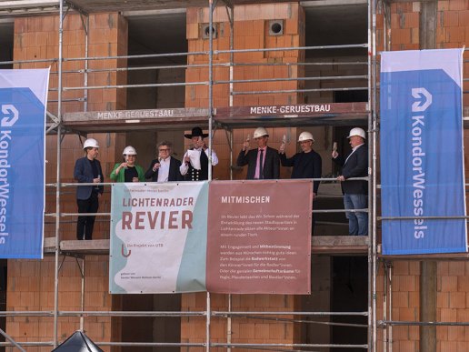 Mit der Umdichtung des Klassikers „House of the rising sun“ sorgte der Wohntisch Lichtenrade für eine gelungene Überraschung. Die Mitglieder des Vereins beschrieben in dem Lied ihren Weg und den Prozess der Bürgerbeteiligung am Projekt Lichtenrader Revier und bedankten sich bei Herrn Bestgen und den Mitarbeiter*innen der UTB. Diese Aktion kam hervorragend bei den Bauschaffenden und Gästen an. Wer kann schon auf ein eigenes Lied seiner zukünftigen Mieterschaft verweisen.
